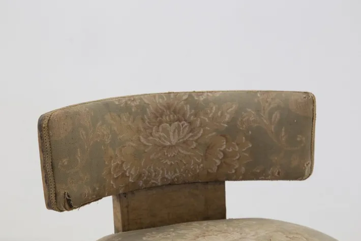 The backrest is in the shape of a T, in fact the frame holds the backrest in a simple tall semi-curved rectangular frame, again in original floral fabric.