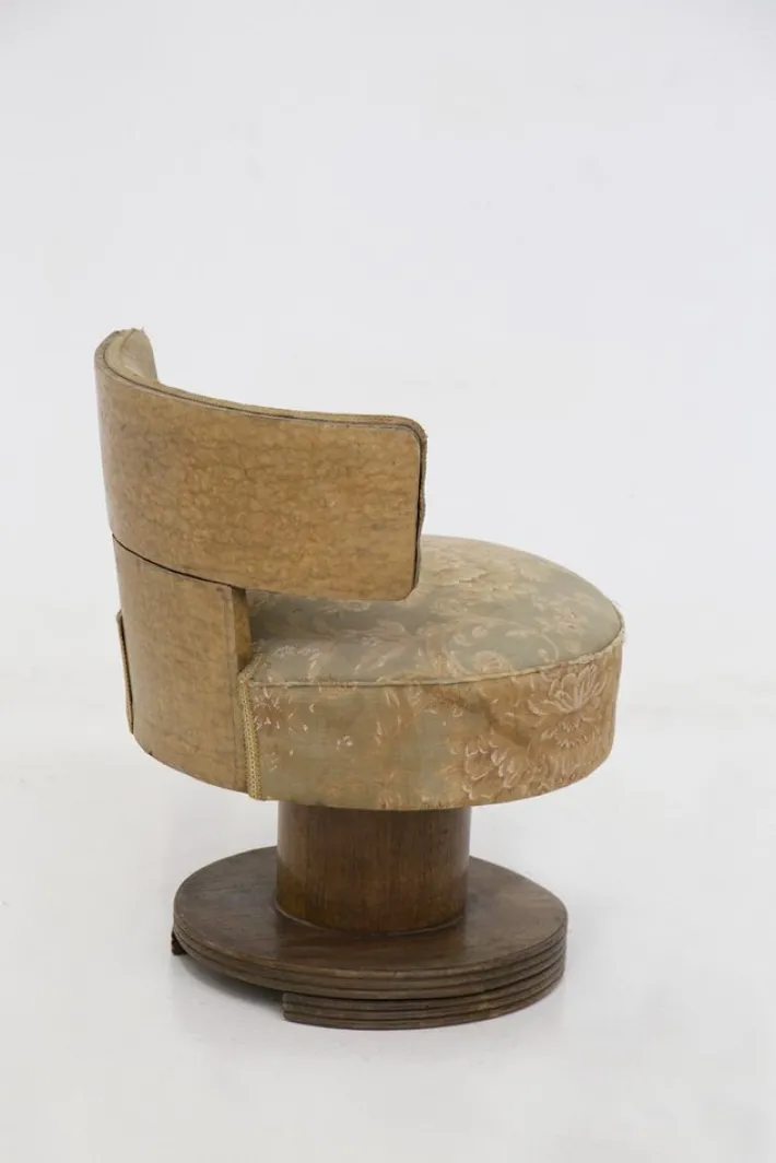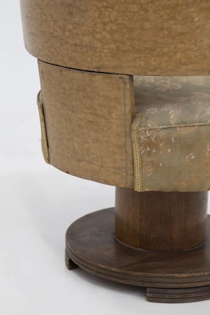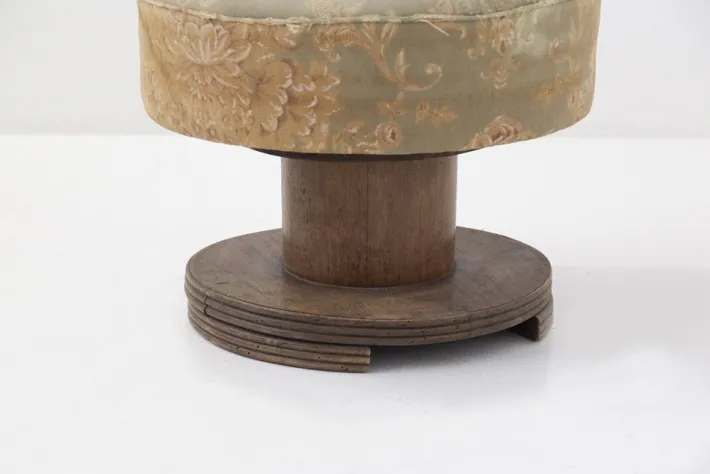 The seat is round and is made with a floral fabric cushion, original to the period. Very comfortable.