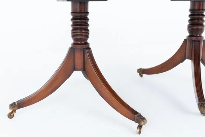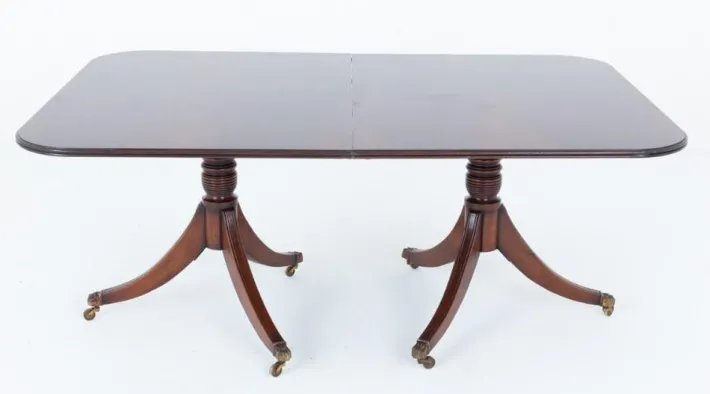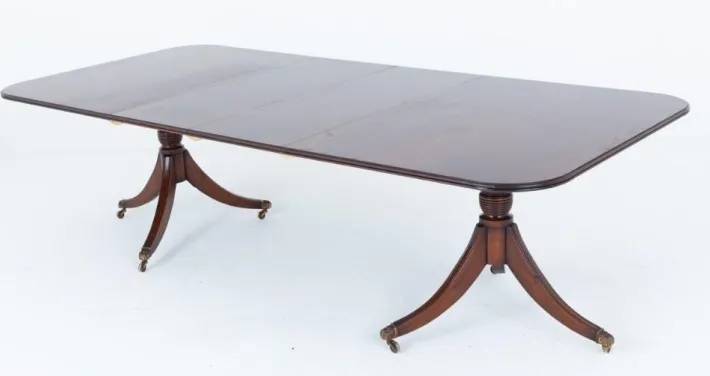 The table extends by way of a pull out action to accept up to 2 extra leaves, the leaves are held in position by typical regency style brass clips The top of the table having double reeded moldings Will seat 10 – 12 guests