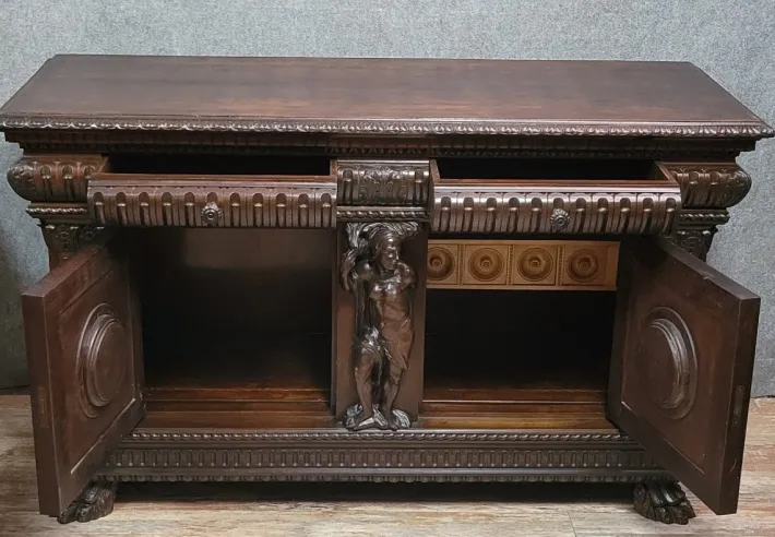 Two drawers and two doors with a very large sculpture of an antique man in the center
