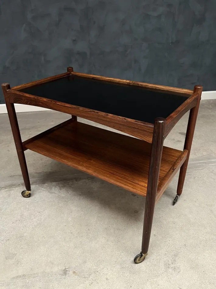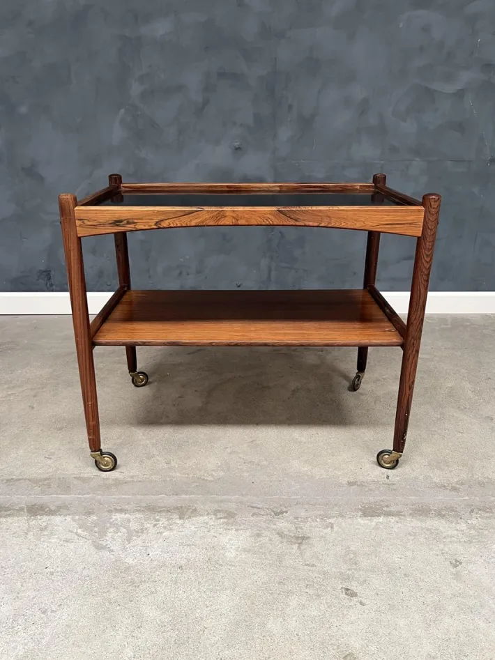 The cart is in very good vintage condition, showcasing beautiful wood grain and functional mobility. A versatile and elegant addition to mid-century modern interiors.