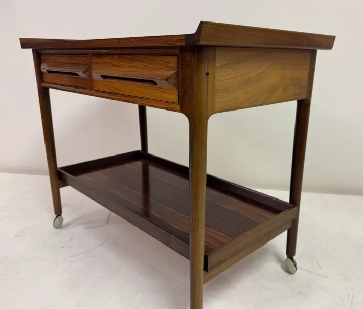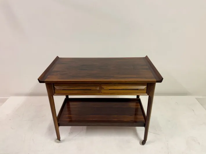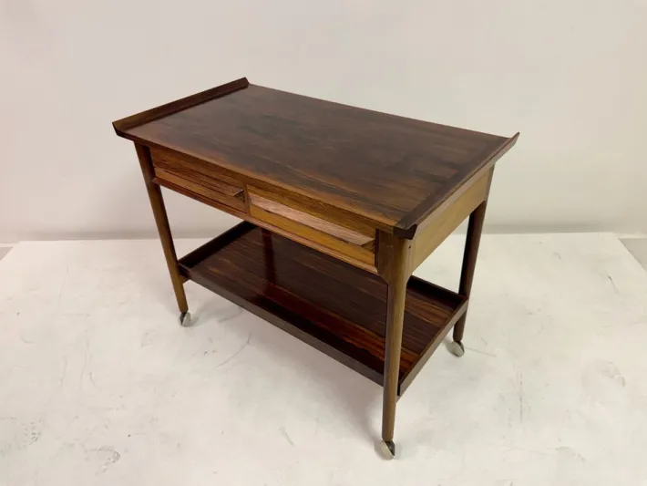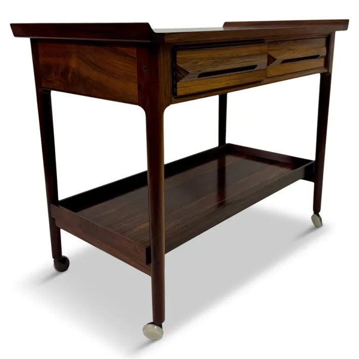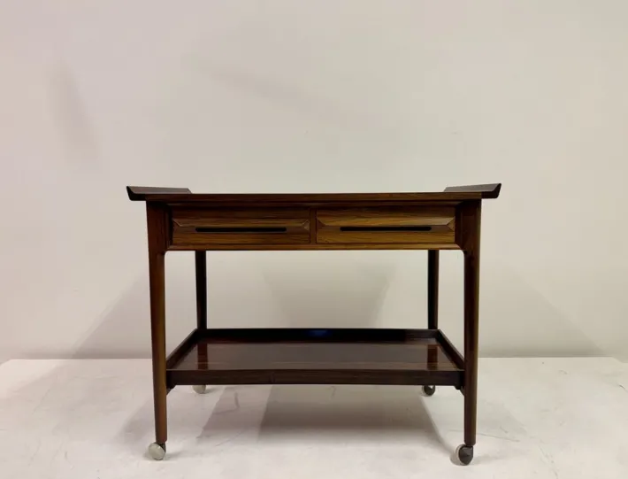 A refined mid-century rosewood trolley designed by Torbjørn Afdal for Mellemstrands Møbelfabrik Bruksbo, Norway, circa 1960s. Executed in richly figured rosewood, the piece exemplifies Afdal’s restrained Scandinavian modern aesthetic, where utility and elegance meet in equal measure.