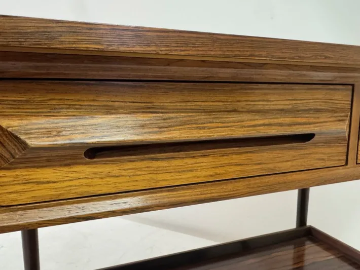 The upper section features two drawers with sculpted recessed handles, their horizontal grain carefully aligned to emphasize the natural beauty of the rosewood. Below, an open shelf provides additional storage and display space. Raised on slender legs terminating in castors, the design is light, mobile, and highly functional.