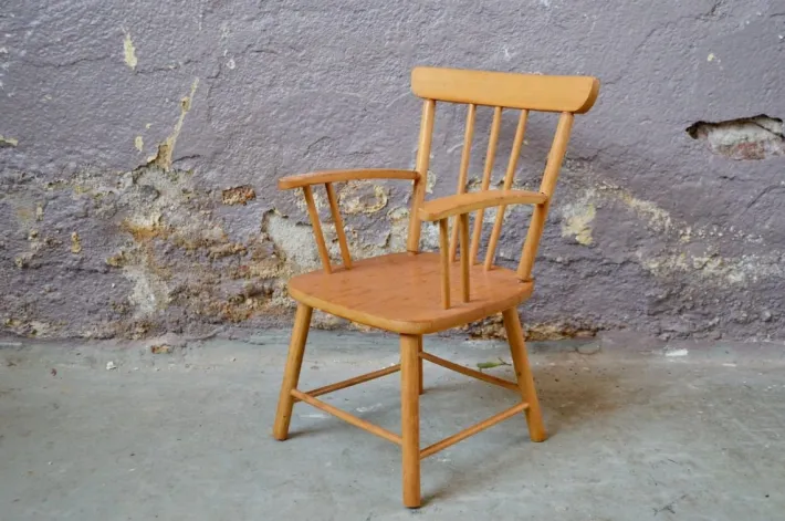 The doll’s chair is made of solid beech wood, with a light golden color. It is in good condition, its design is typical of mid-century Scandinavian productions.