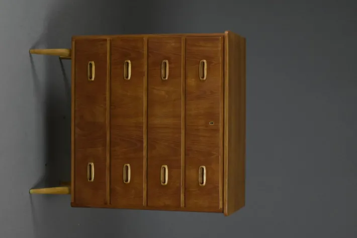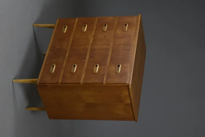 The surface has been carefully refreshed in our workshop and finished with a hardwax oil, enhancing the warm tones of the teak veneer and ensuring durable protection. Its compact yet generous proportions make it an ideal solution for both living and bedroom interiors.