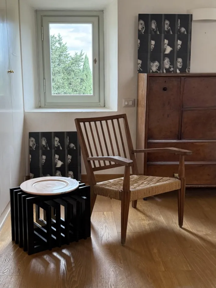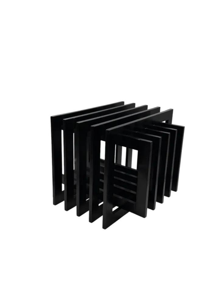 The object can be used as a simple floor or table sculpture, as a side table with a glass shelf or tray on top, or as a magazine/book holder.