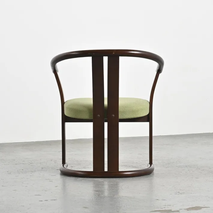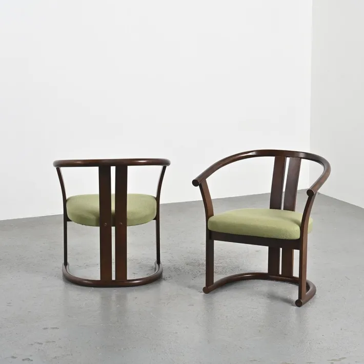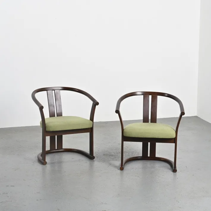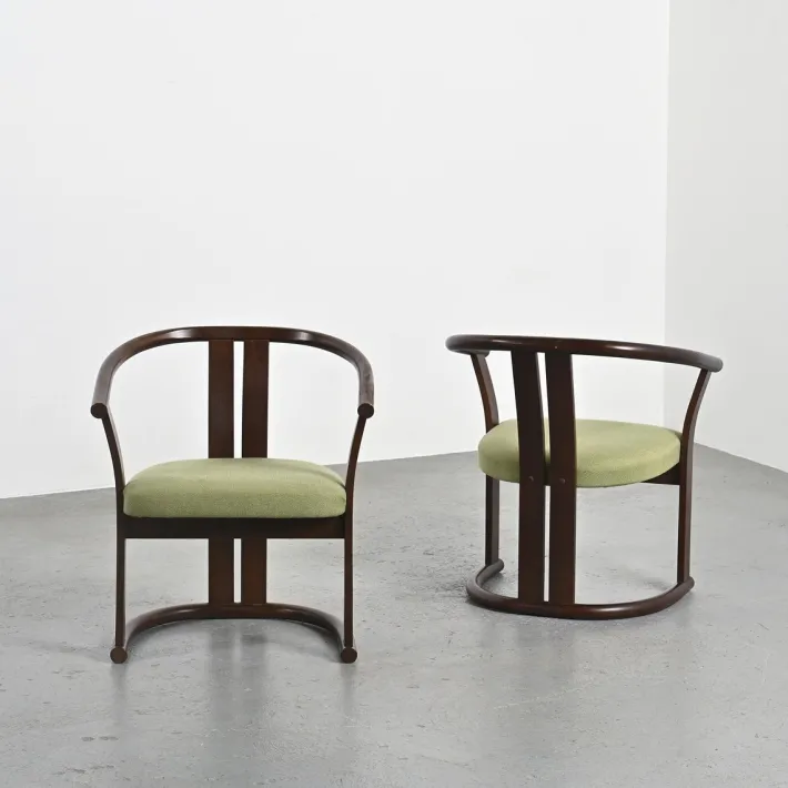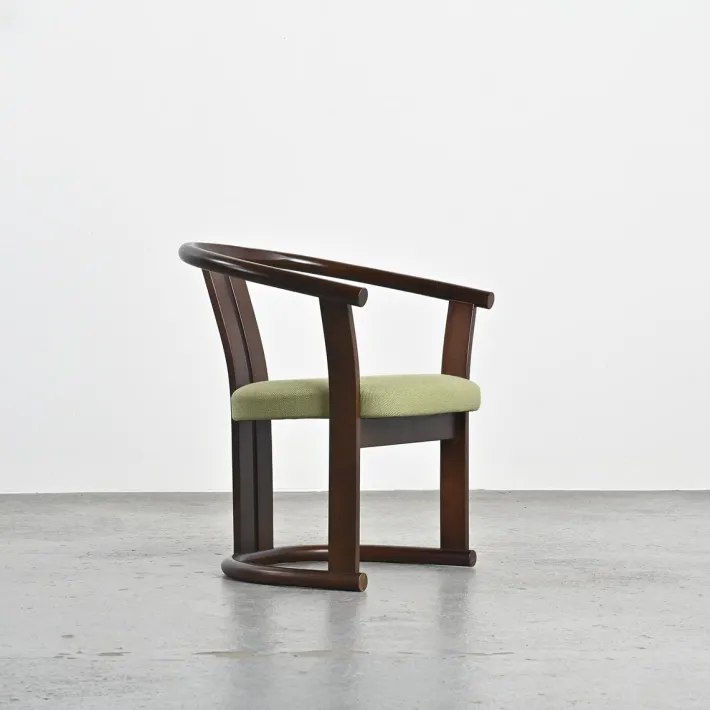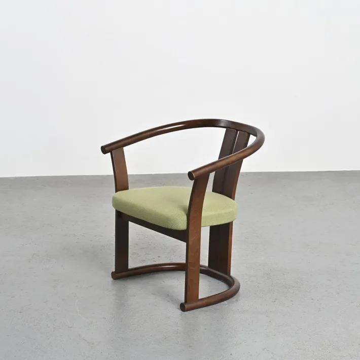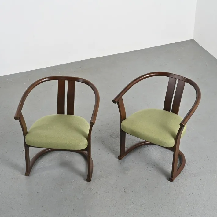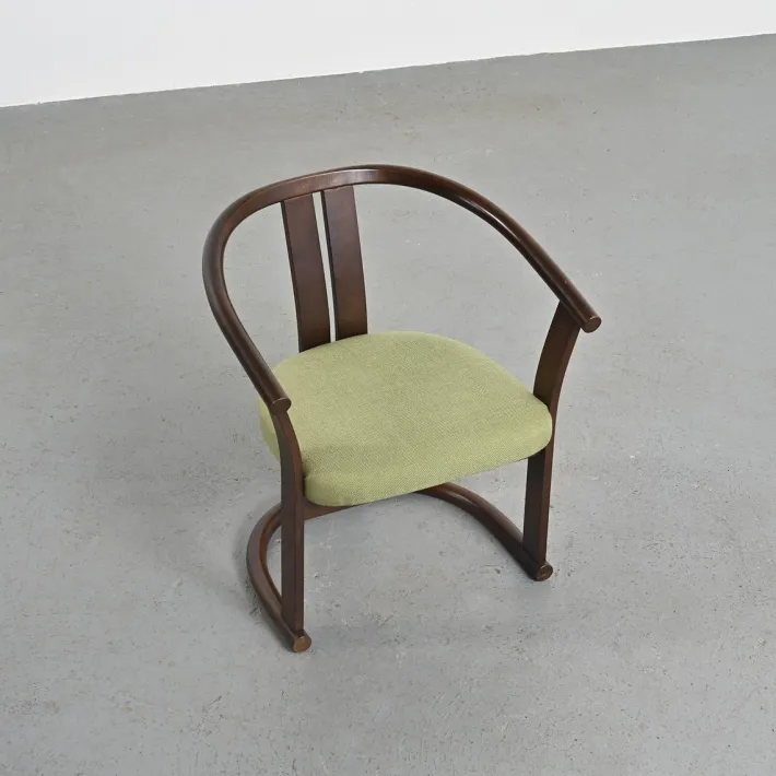 These armchairs perfectly embody the style of modernist Japanese design. Their bentwood structure creates a continuous line between the armrests and the base, giving the armchair a soft and fluid silhouette. The seat, generously padded and covered in a textured green fabric, provides comfort and sobriety.