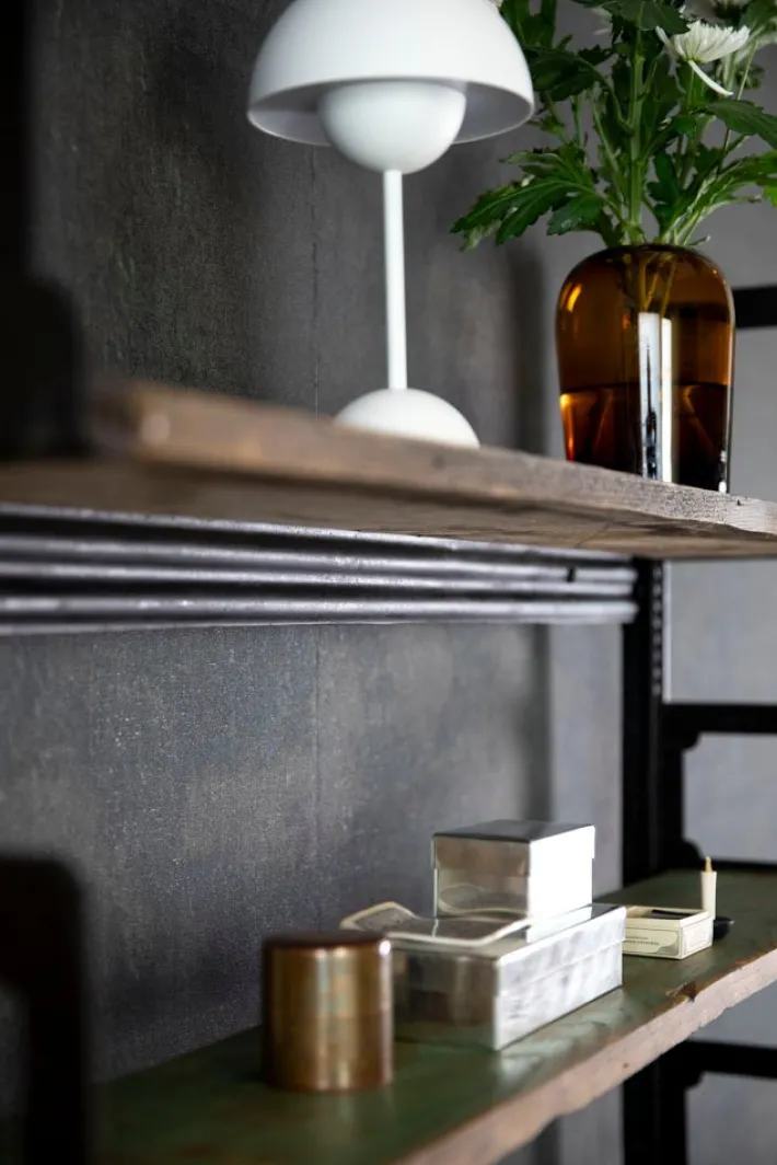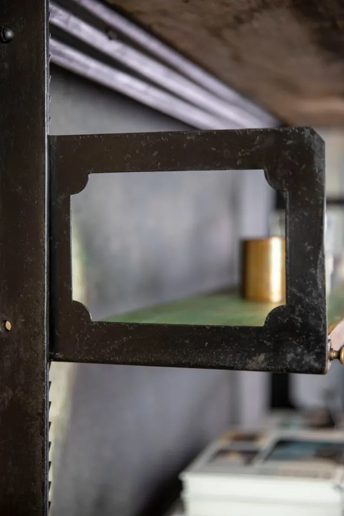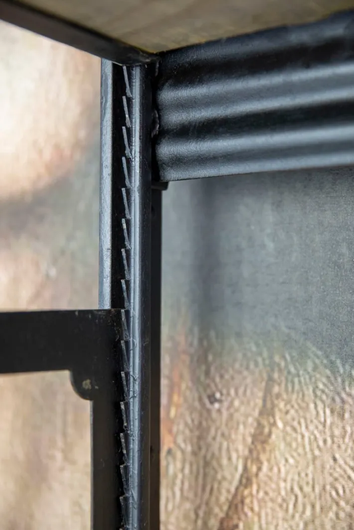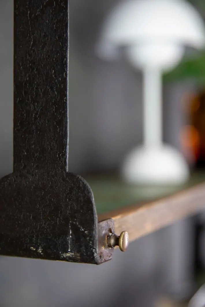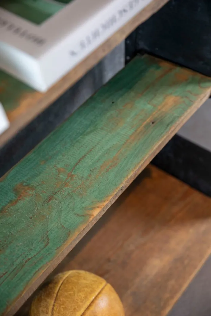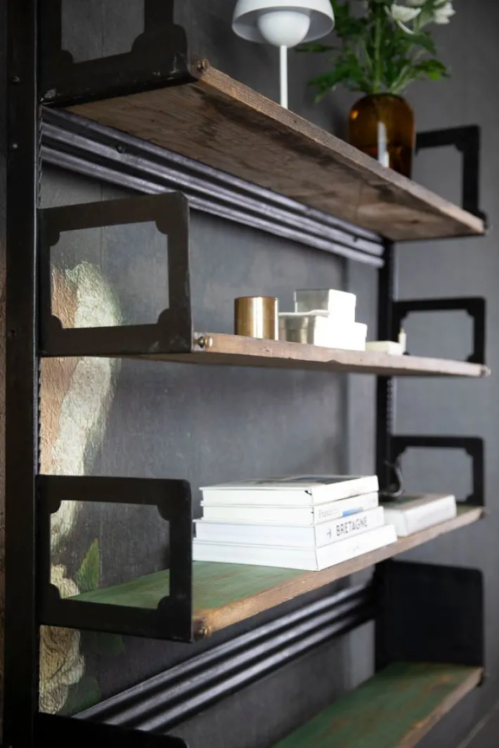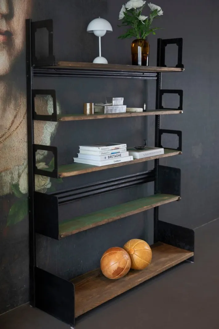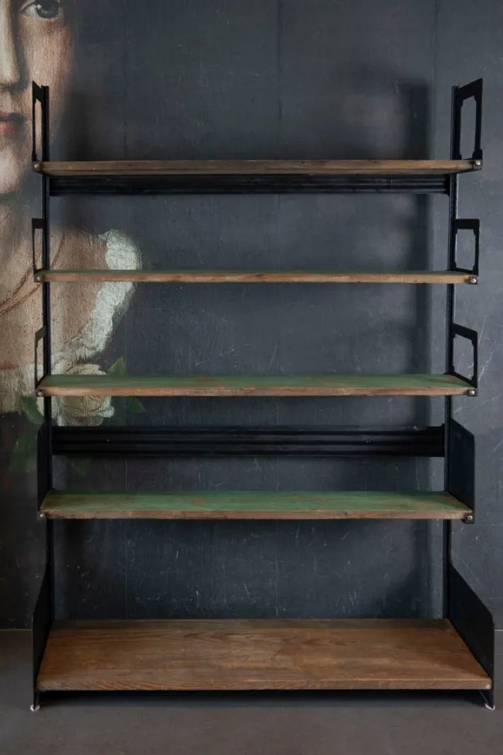This bookcase uses wooden shelves, unlike conventional shelves. Chic, the color spectacular. The five shelves are easily adjustable in height thanks to a sophisticated grid system. A system that made Strafor famous, along with its “corrugated iron design.” The original bookcase was probably taller, but now fits comfortably in any living room or office. Unique!