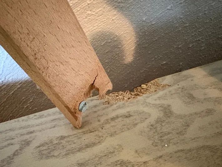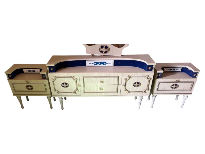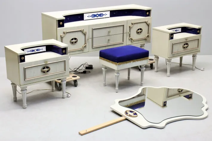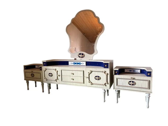 The wooden support of the mirror is broken (see detail photos). The rest of the set is structurally sound and in good vintage condition with light wear consistent with age and use. The mirror itself is intact and usable but will require repair or reinforcement to be securely mounted.