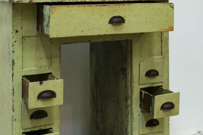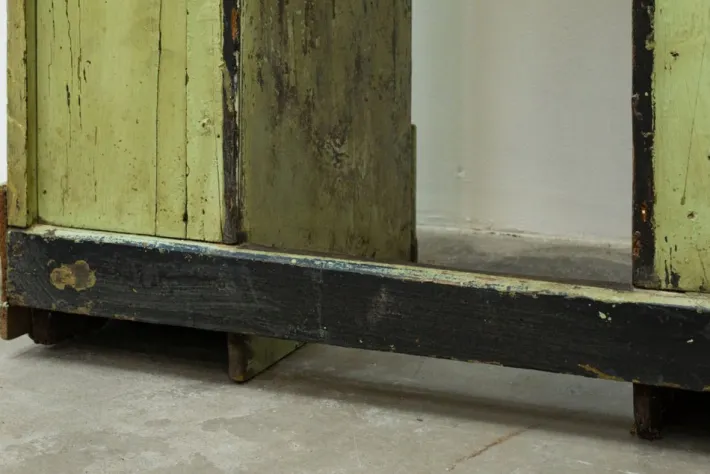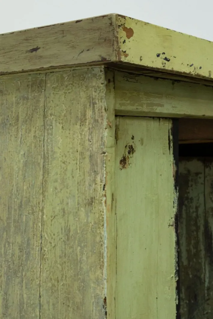 The wooden edge on the shelf on the right side was also missing and was rebuilt and aged to be able to integrate it with the furniture.