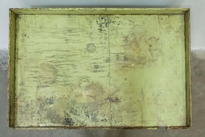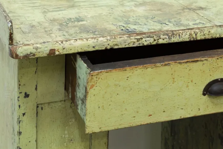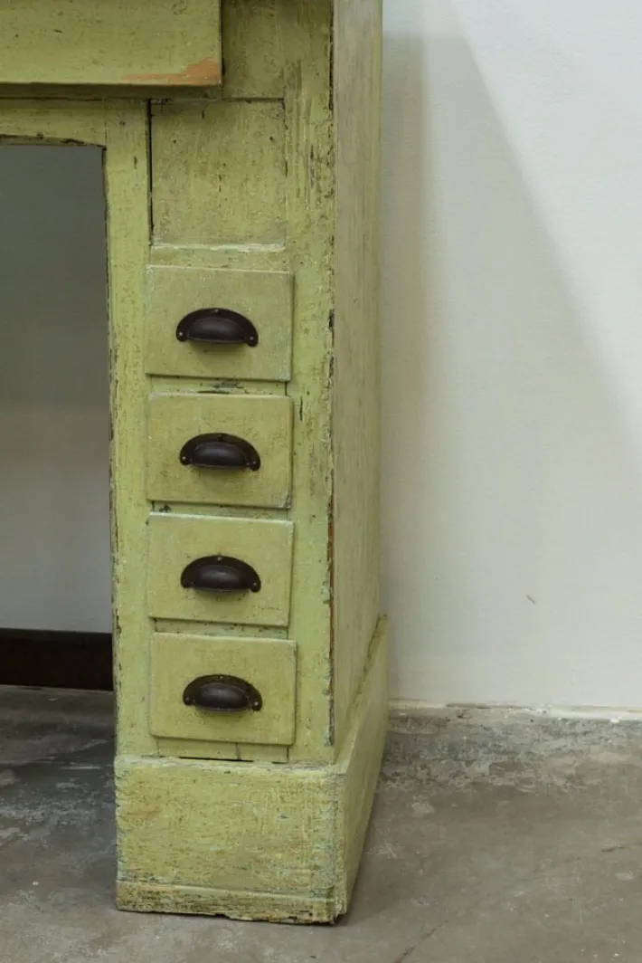 It was covered in a shiny blue enamel, under which there was still its original paint which has been recovered, cleaned and restored! Obviously it was already ruined and was missing in several parts of the furniture (which is why it was repainted with blue enamel)