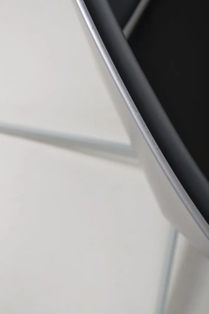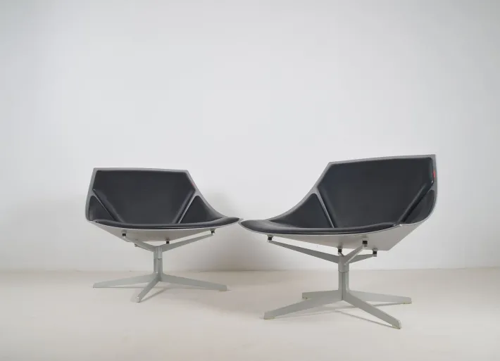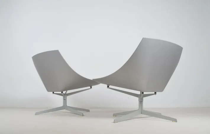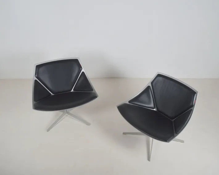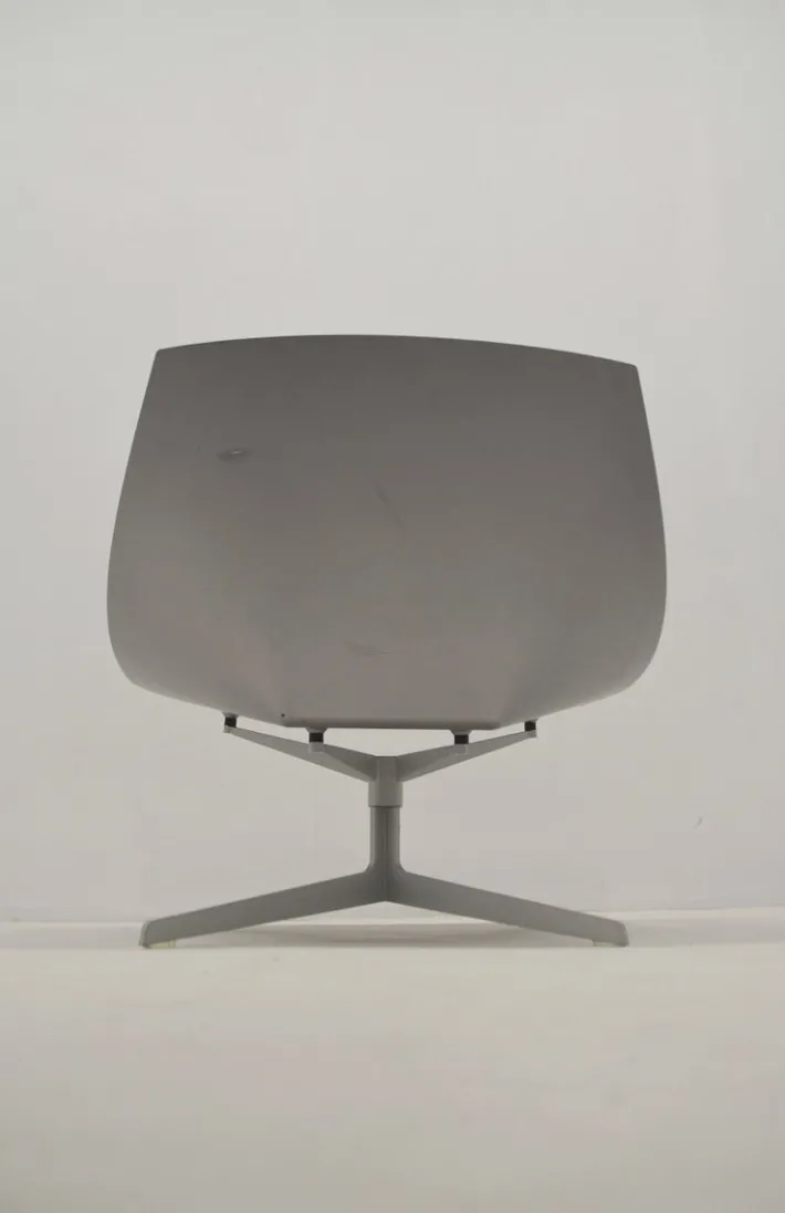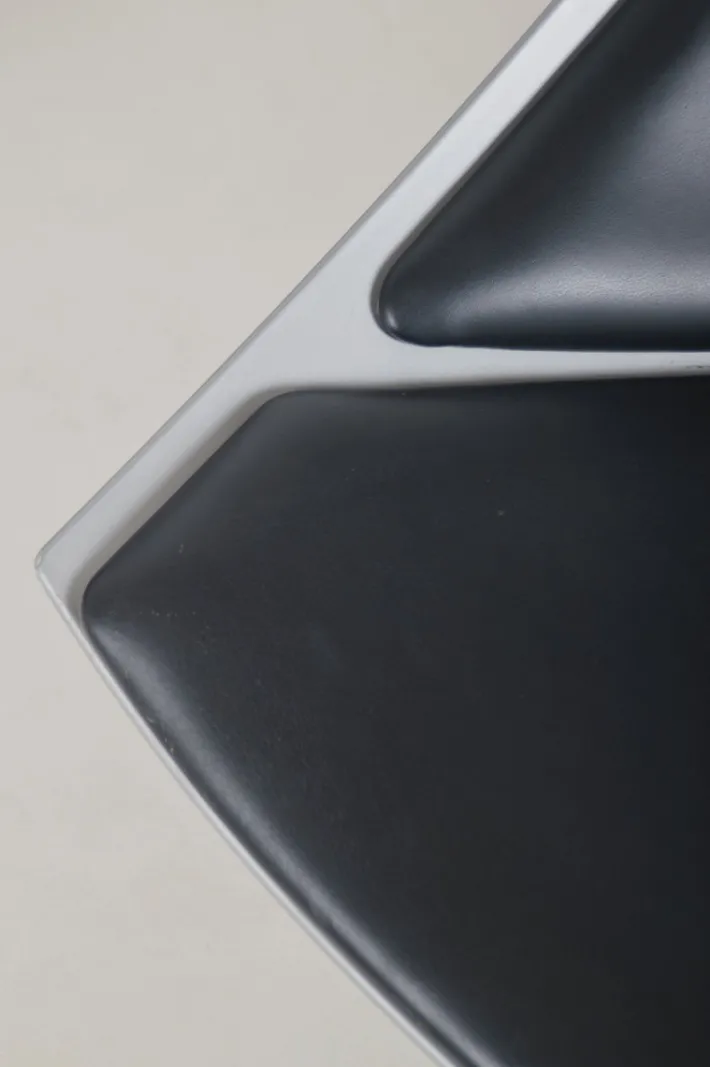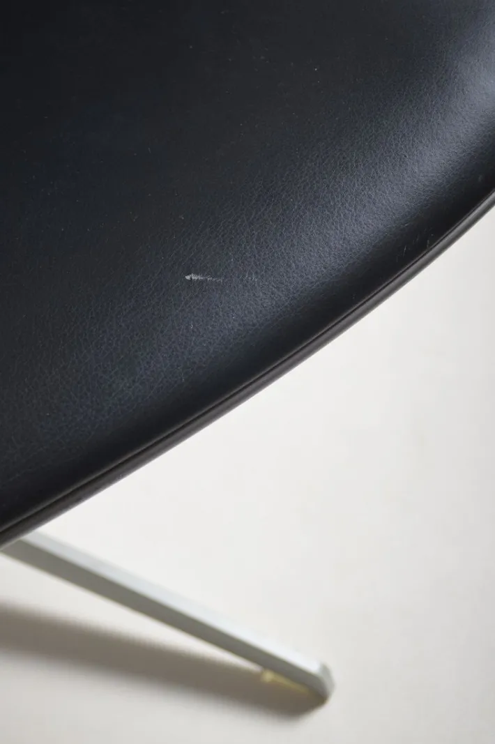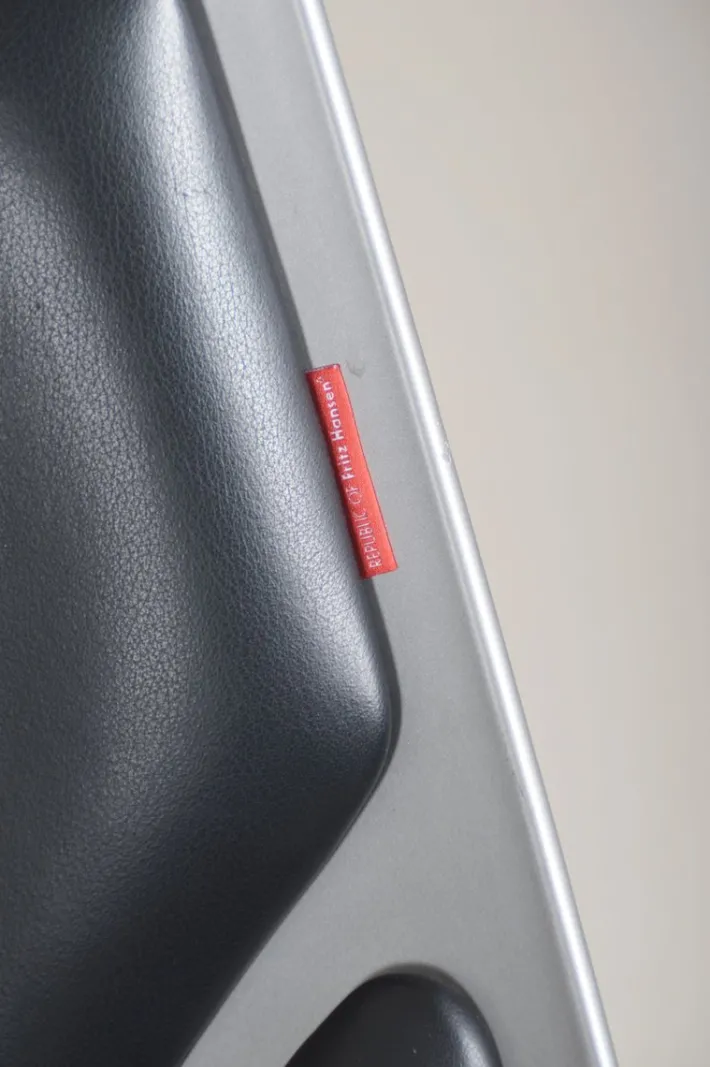 These are examples from the production year (2007) with leather upholstery. The seat is made of injection-molded, fiber-reinforced plastic in a matte metallic gray. The steel base allows the chair to rotate 360° for optimal comfort. Transparent protective covers are fitted to the bottom of the legs.