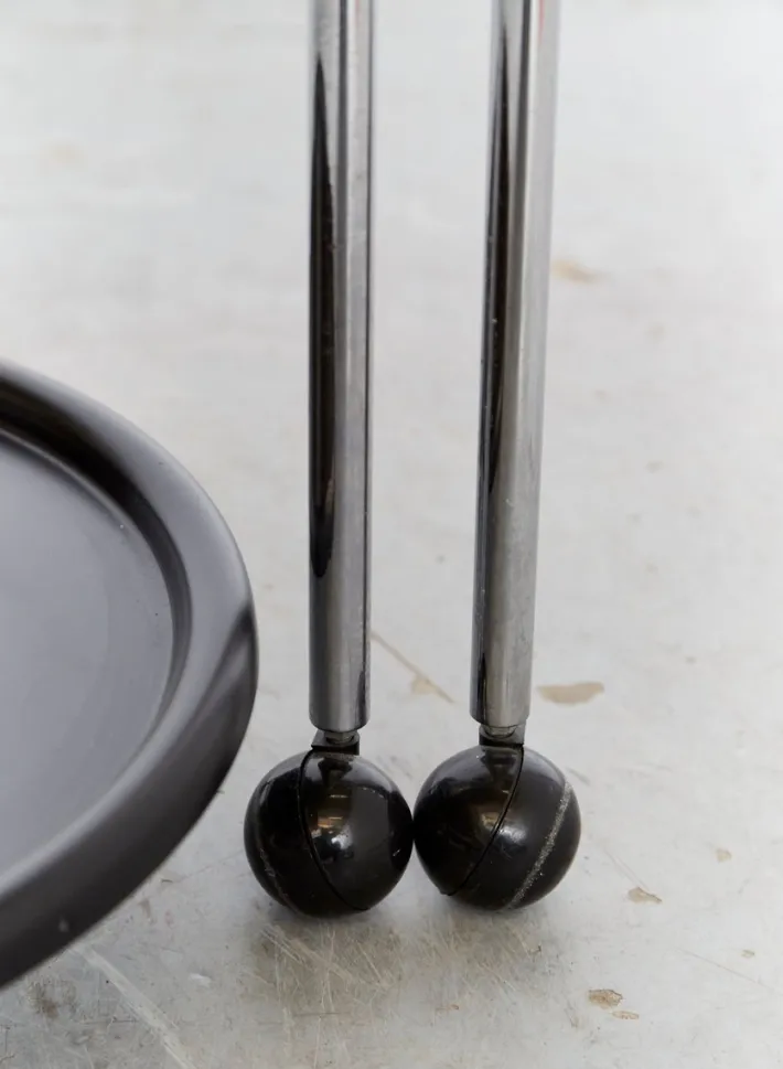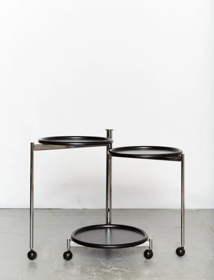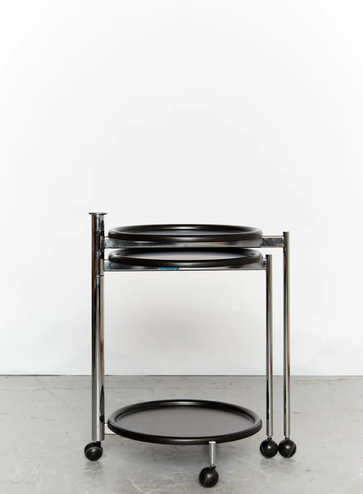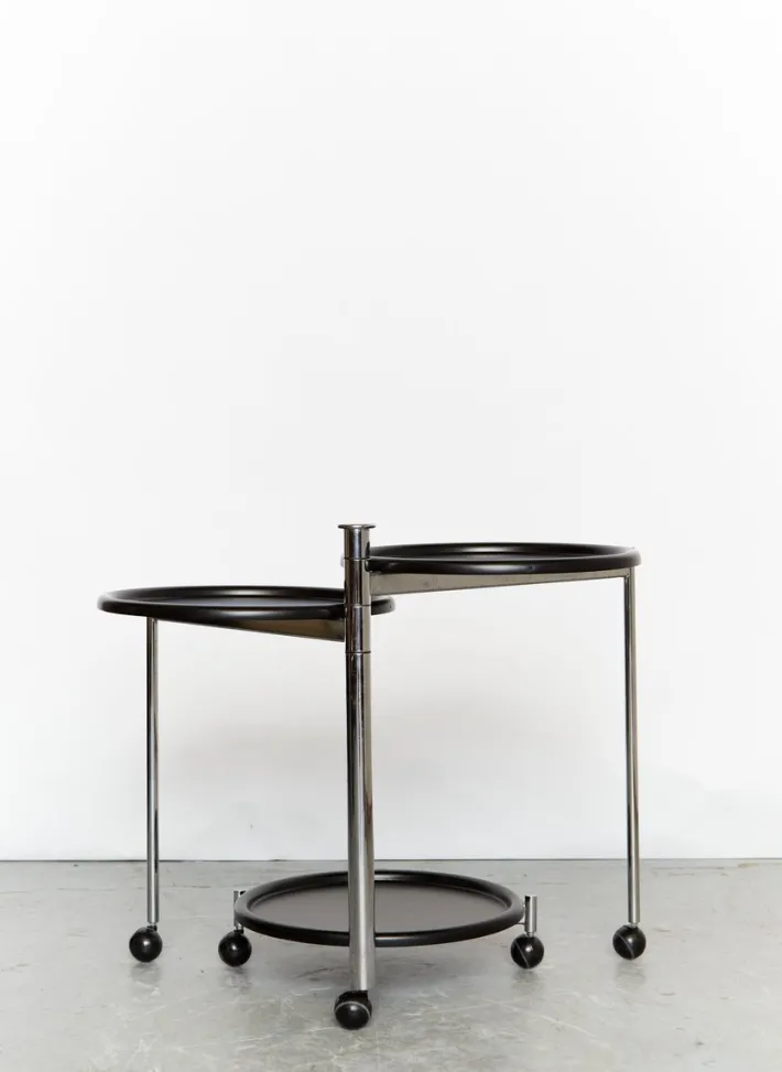 The table offered here was designed by Kita in 1986 for the Italian manufacturer Cidue. This mobile cart table consists of a tubular steel frame and three aluminum trays. Thanks to its casters, the table can be extended for parties, allowing each tray to accommodate appetizers, wine bottles, glasses, etc. The trays are removable.