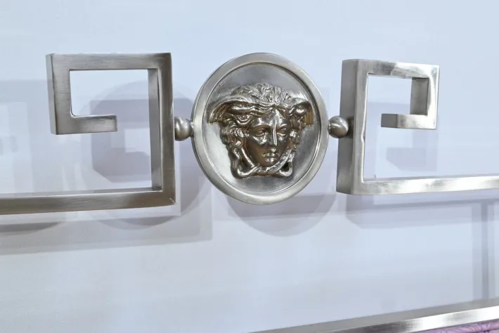 At the top of the headboard, a mascaron, the emblem of Versace, sits proudly, symbolizing the opulence and prestige associated with this world-renowned brand.