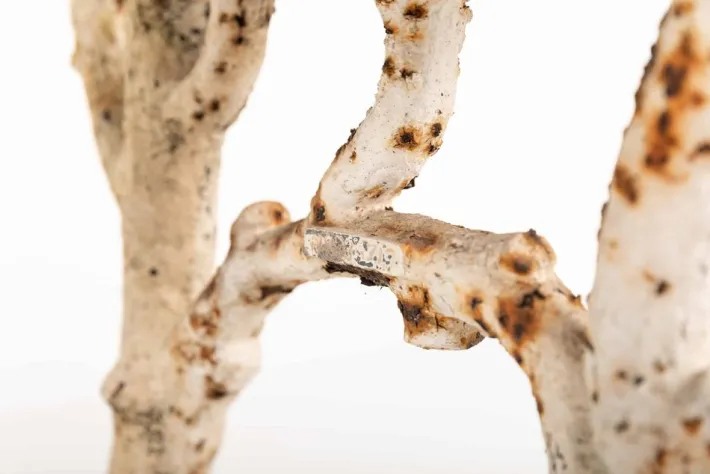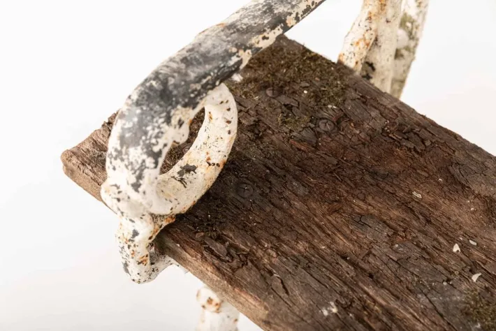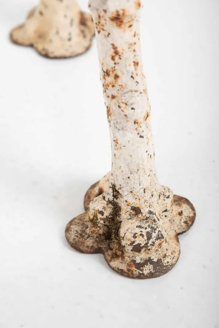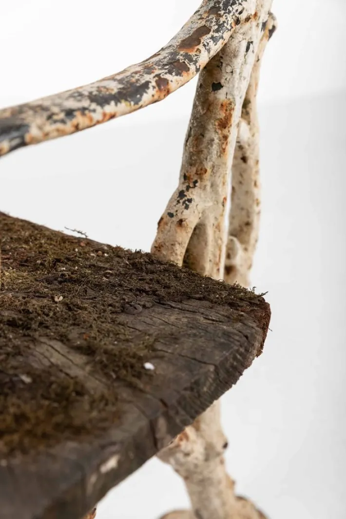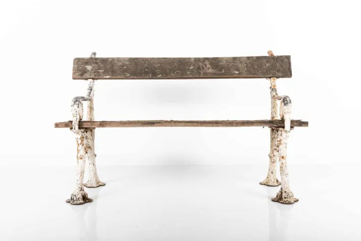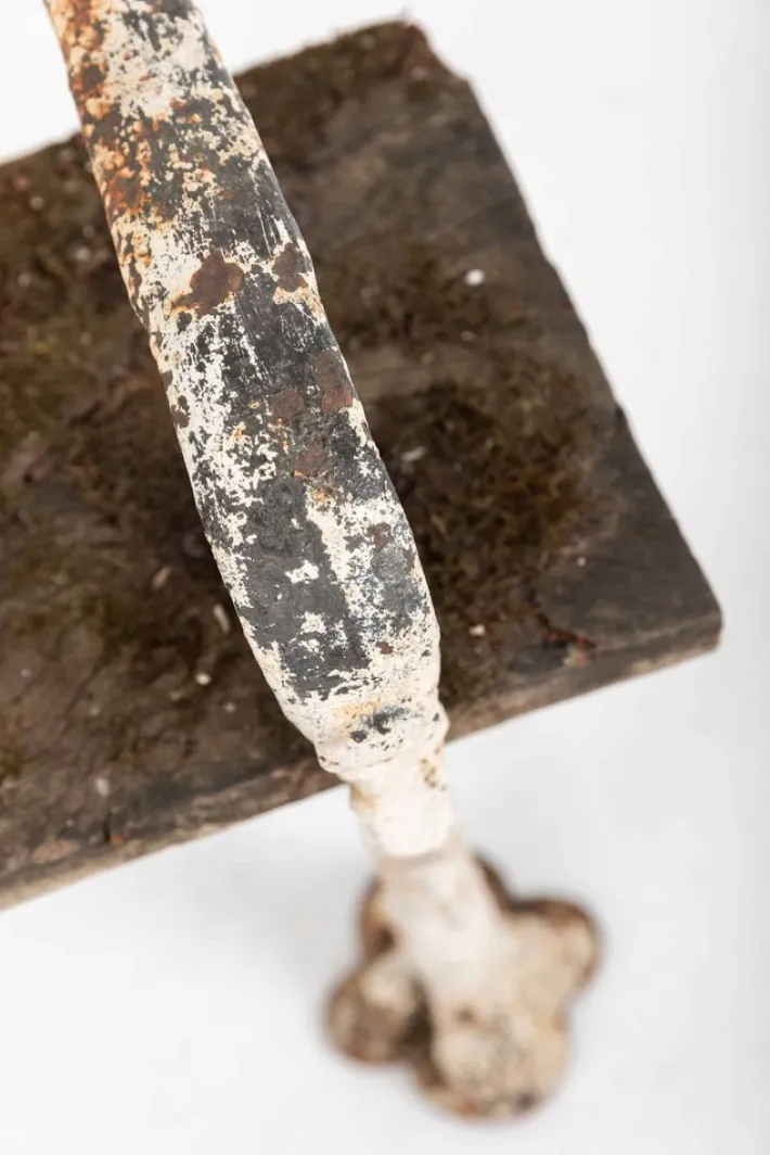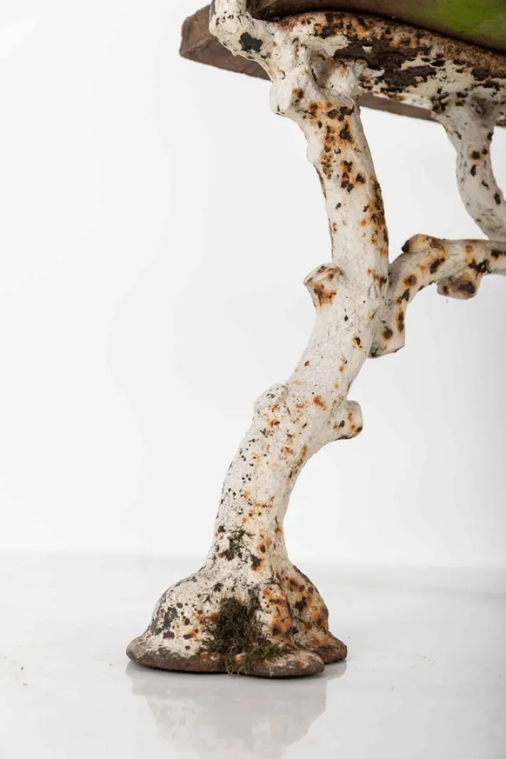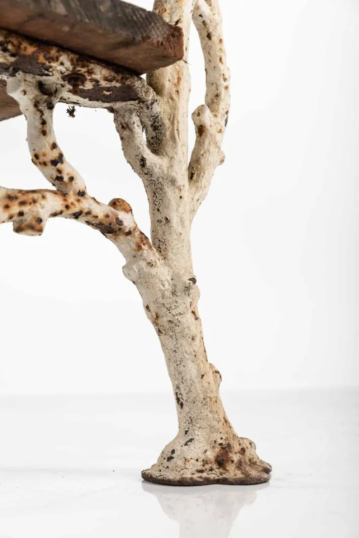 Designed to imitate the branches of a tree in the form of a bench but cast out of iron. Original white paint with heavy patina. Single planked seat and backrest both structurally sound. We have decided to leave this bench in it’s natural beauty – moss n all – and will leave this up to the eventual owner to remove if desired.