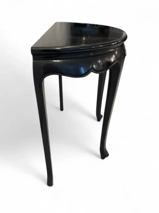 The smooth, crescent-shaped top rests on slender, slightly flared legs that offer a poised and balanced stance. Fine craftsmanship is evident in the hand-carved details, lacquered finish, and seamless joinery—hallmarks of quality furniture from this transitional period between Edwardian tradition and modernist experimentation.