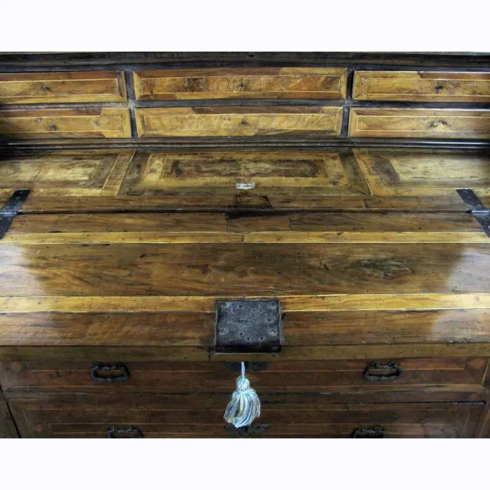 It is an imposing drop-leaf chest of drawers, veneered in walnut, decorated with cherry wood frames arranged against the grain and enclosed by maple fillets, which are also repeated inside the drop-leaf. Walnut burl panels are only present on the central decoration of the sides.