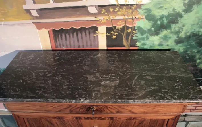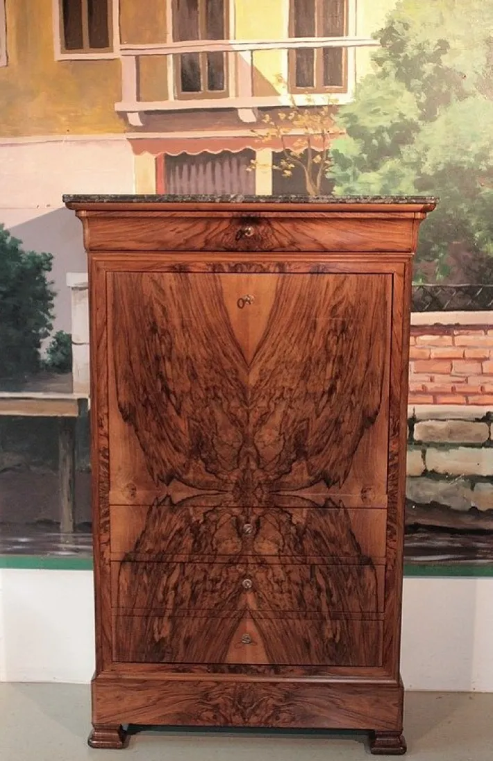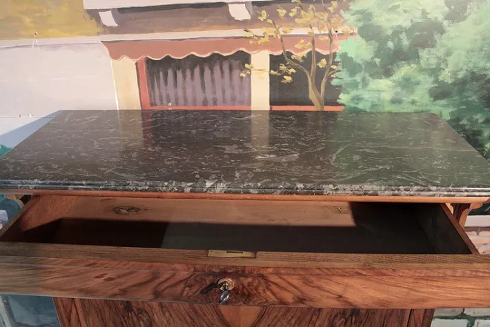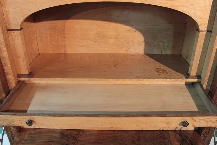 The seat, covered in black leather changed, discovers a theater in maple speckled clear topped with 6 small drawers in various dimensions, with rosewood buttons.