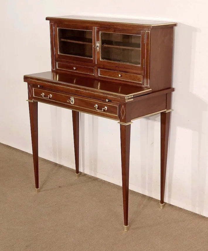 Its center is equipped with a single drawer whose front is surrounded by a brass quarter round. Two Louis XVI brass handles frame an authentic lock in working order, with an oval bronze entrance topped by a Louis XVI knot. On each side, a brass inlay forming a rhombus brings a touch of originality to this property. On top, two pulls with “lens” buttons allow the writing part to be held in place, which unfolds thanks to hinges. We discover an interior part darkened by a green leather almond with cold vignette, golden vignette and angles with golden patterns too.