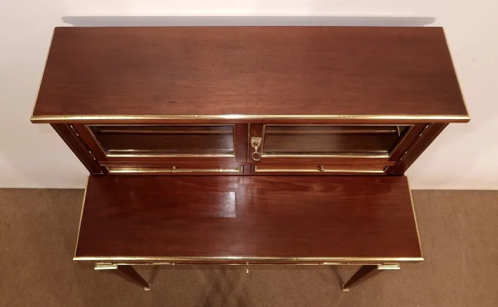 Above, two small framed doors in solid mahogany are glazed on discreet brass knobs. The right door closes on the left side with a small brass cover. We find an original lock with key in working condition decorated with a pearled Louis XVI entrance.