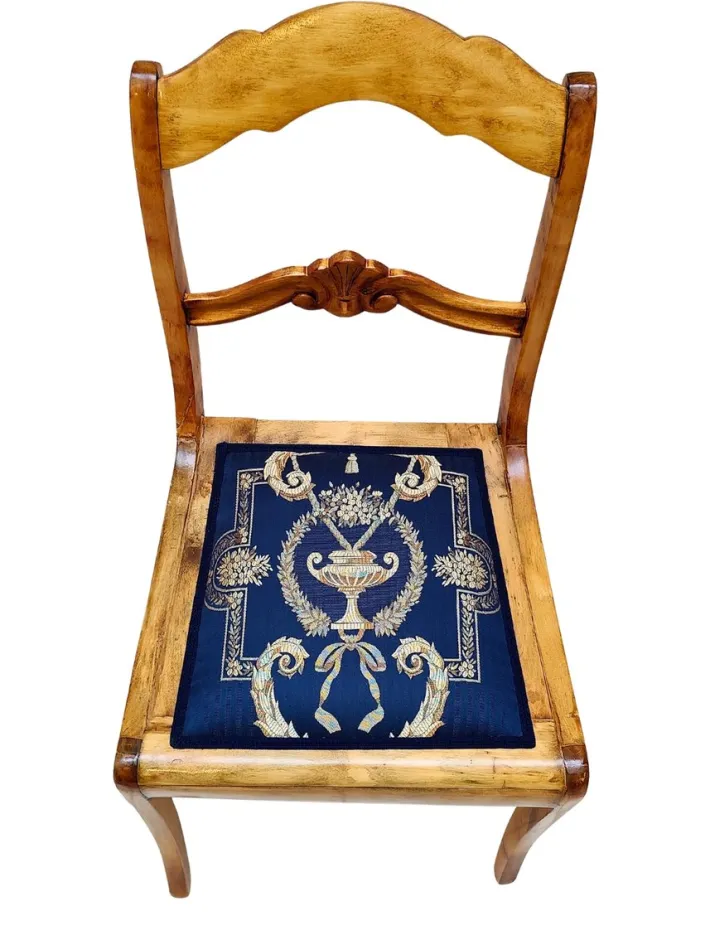 The seat has been newly upholstered with a striking deep blue neoclassical fabric depicting urn and laurel wreath motifs, adding a refined contrast to the light wood. The chair has been carefully restored and hand-polished, preserving its historical charm while making it ready for contemporary use.