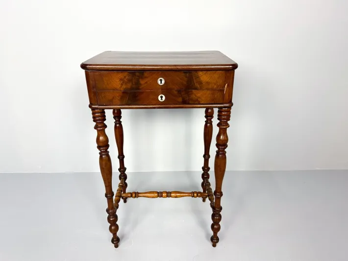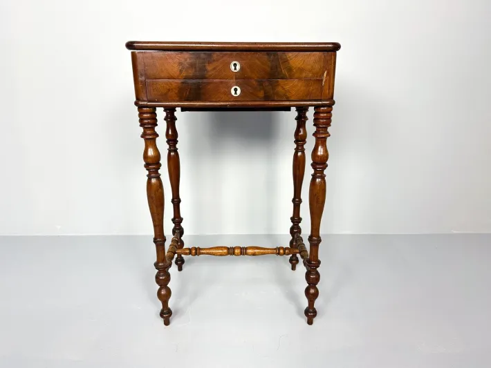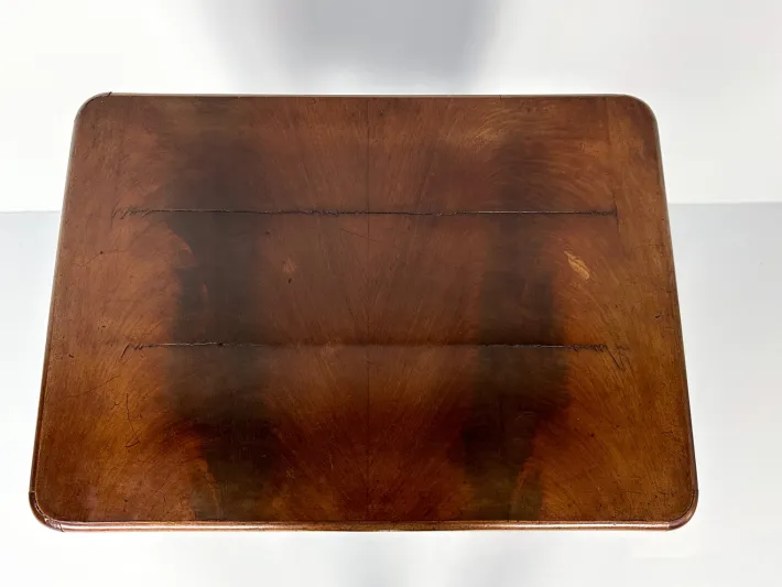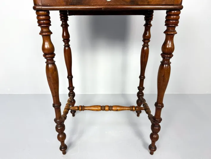 | Restoration and Damage Details | Light wear consistent with age and use, Heavy signs of use, Patina consistent with age and use, The tabletop has age-related veneer cracks, Chip on front, Basket missing |