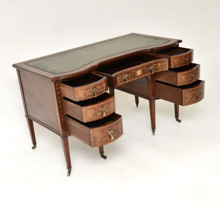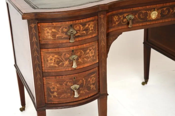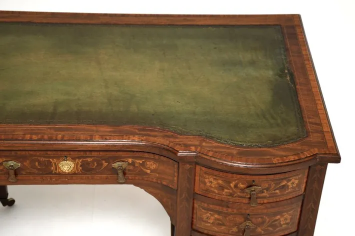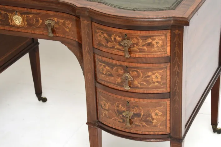 This is of outstanding quality, it is extremely well made and is a lovely size. The wood has profuse floral inlays of satinwood on the drawer fronts, with a lovely image of a face on the central drawer. The top has inlaid satinwood banding around the inset tooled leather writing surface, there is also inlaid satinwood banding around the borders of the sides and back panels. The drawers have detailed brass handles, with fine, hand cut dovetailed joints. The central drawer has the Edwards and Roberts makers mark stamped on the edge, the upper right drawer is fitted out with stationary holders.