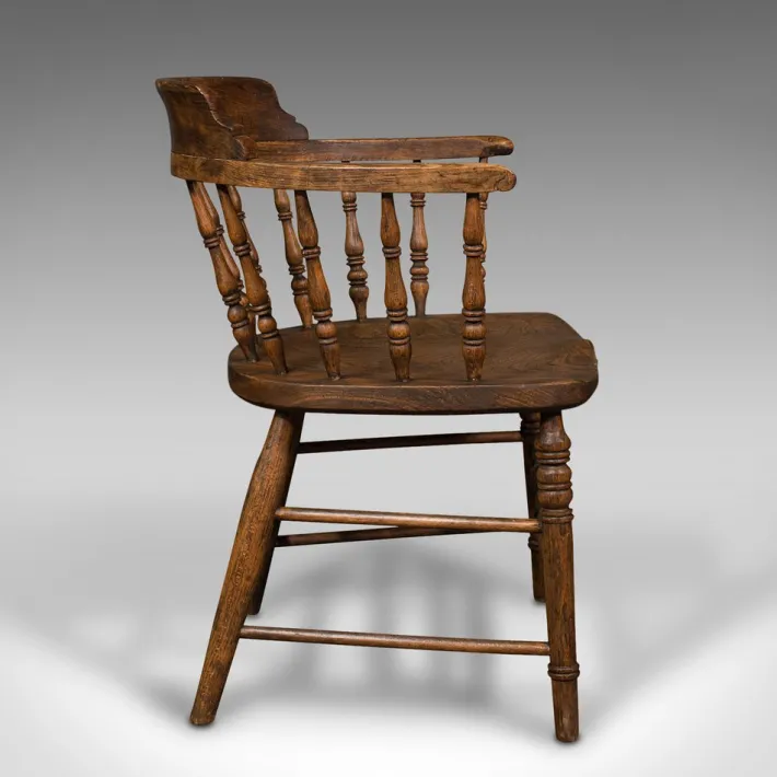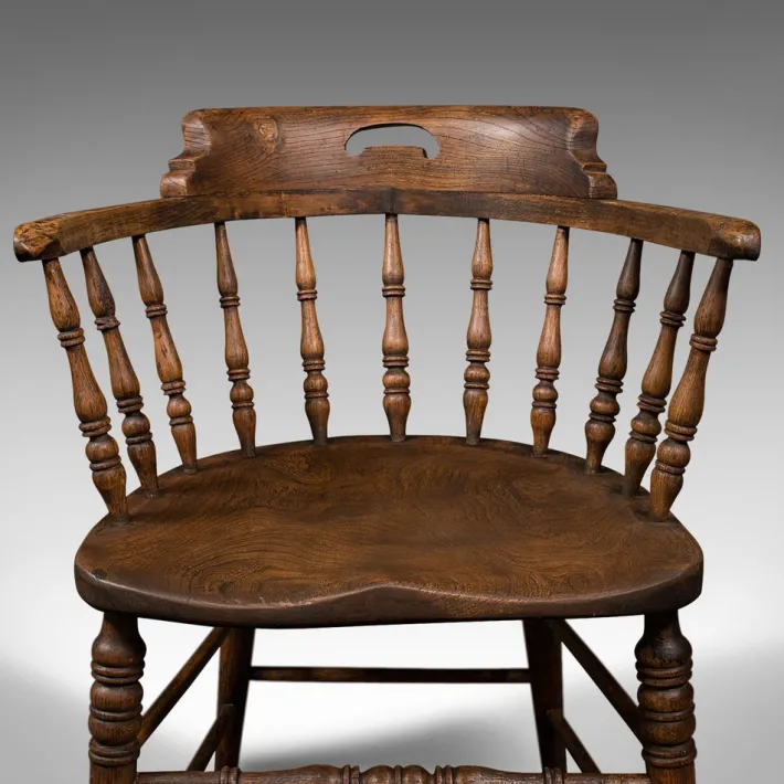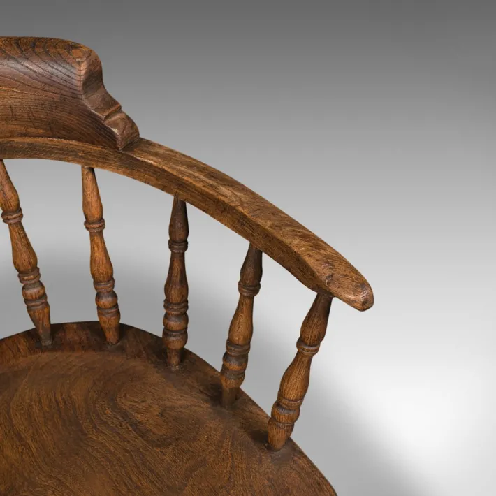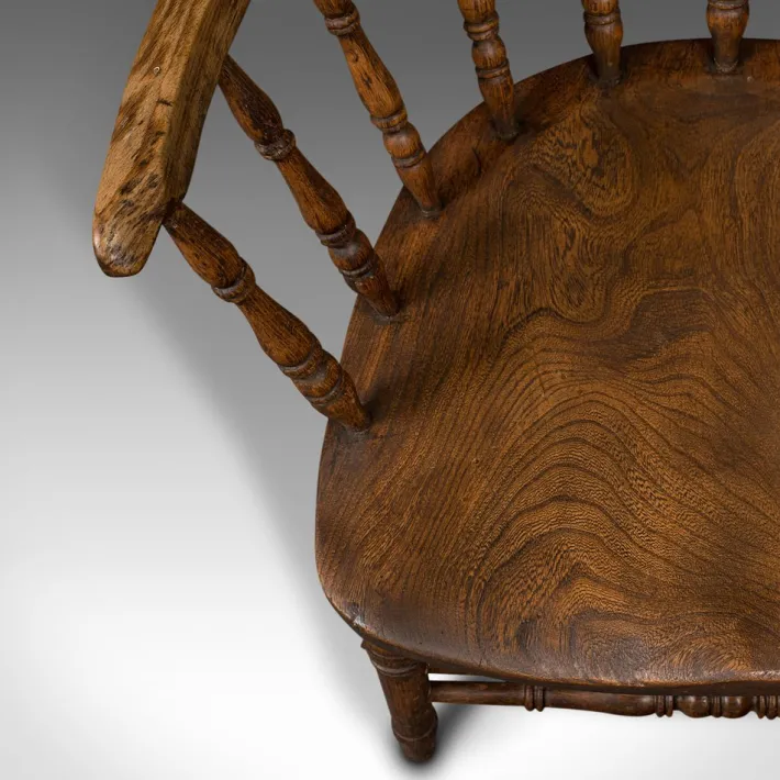 Eleven desirable spindles rise obliquely supporting the horseshoe armrest in ash