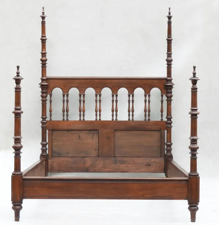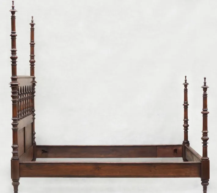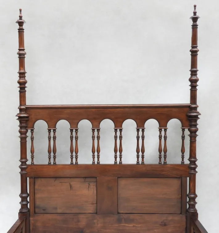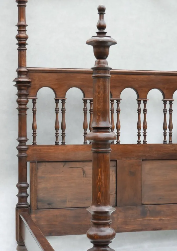 An artisan-crafted bed, beautifully carved in oak with tall turned finial posts at each corner and turned double spindle arch detailing. This bed has been sympathetically lengthened to accommodate a full-length US Queen size, UK King size or standard European double bed base and mattress over the full width of the bed. Dismantles for transportation.
