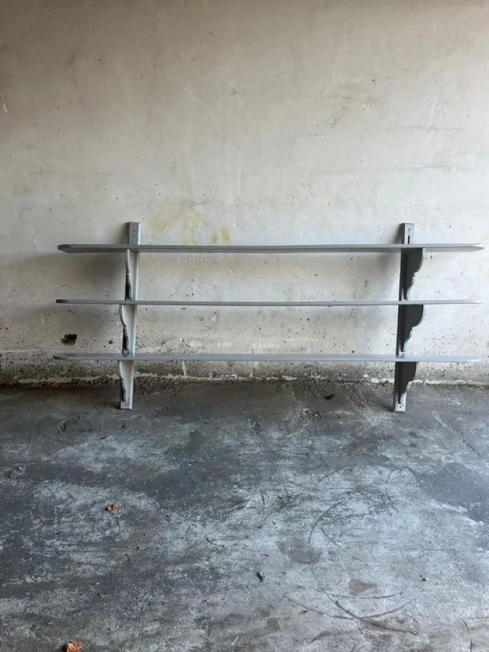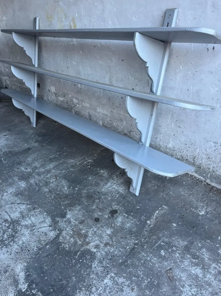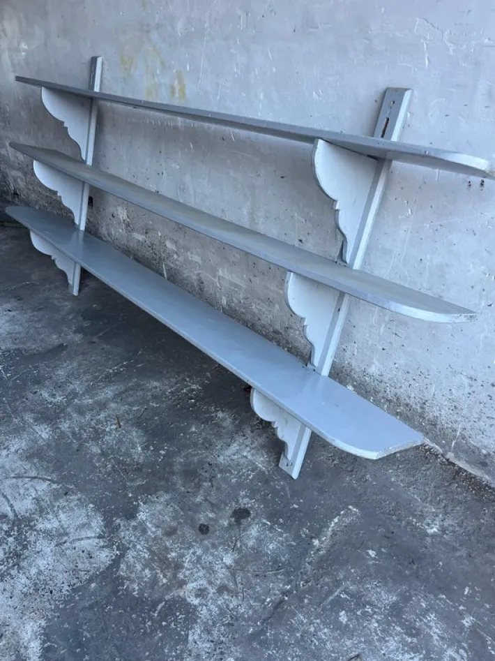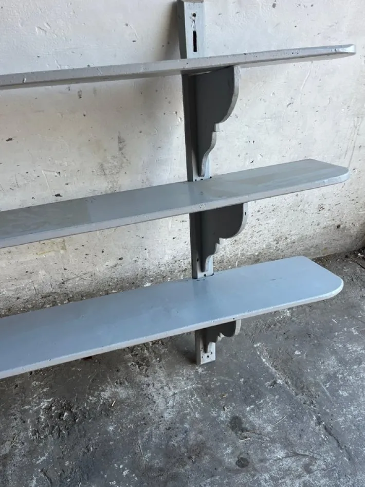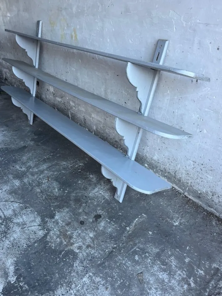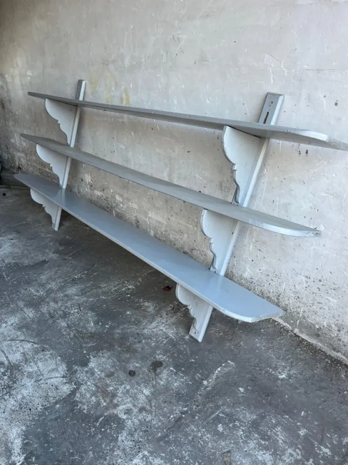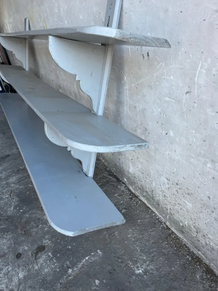 Specifications • Dimensions: H 117cm, B 249cm, D 28cm • Material: Solid wood • Color: Painted grey • Style: French farmhouse / industrial • Origin: Southern France, early 20th century • Condition: Vintage, with later paint and light wear consistent with age