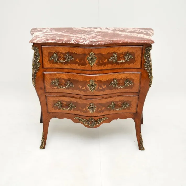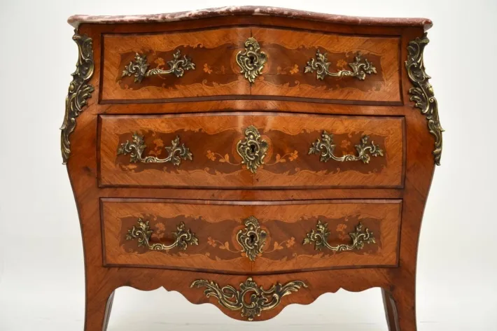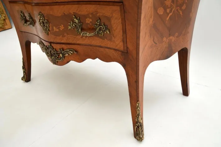 It is of superb quality and is made from various woods inlaid in gorgeous designs. The quality is outstanding, this is a lovely size and has lots of storage space inside the two generous drawers. There are beautiful gilt bronze mounts, handles and escutcheons which are also of extremely fine quality.