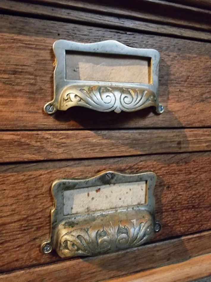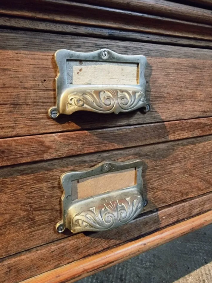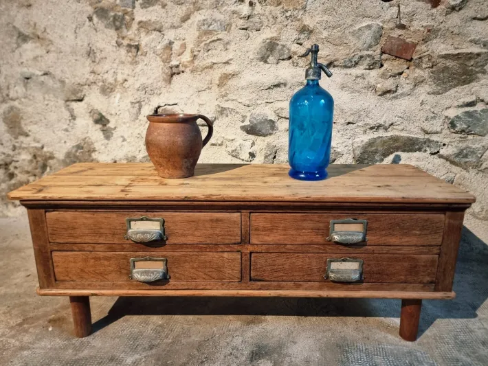 The piece is designed with a solid oak front and a pine structure, combining strength with rustic character. It features four drawers fitted with nickel-plated copper handles and integrated label holders, offering both functionality and a distinctive early 20th-century look.