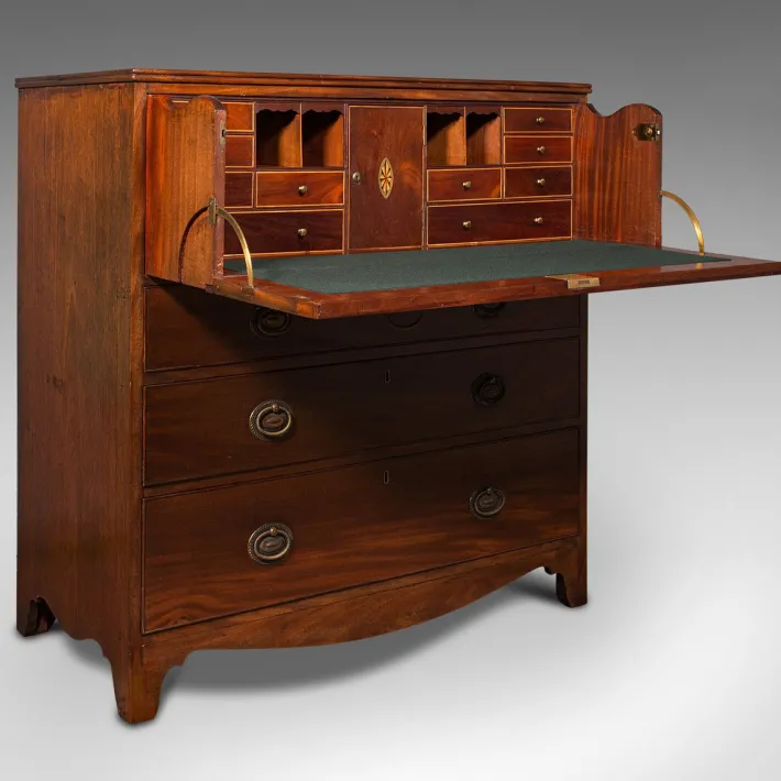 This is a superb antique secretaire cabinet, of fine quality and attractive finish. Beautifully appointed writing interior of comfortable proportion a highlight of this example of Georgian furniture. Solid joints and construction, delivered waxed, polished and ready for the home.