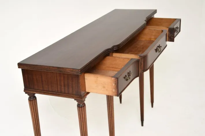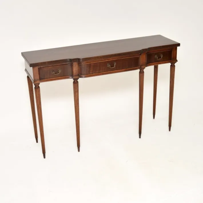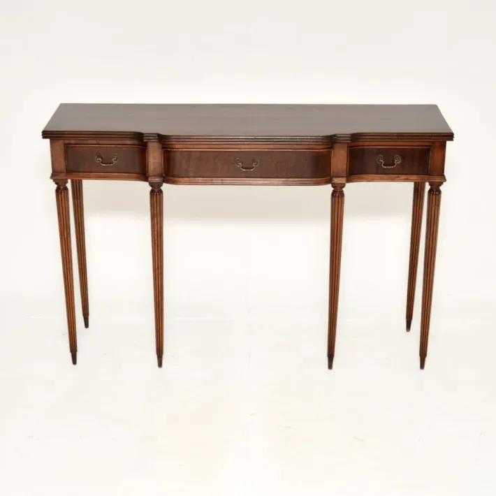 This is of beautiful quality and is a very useful size, with useful storage space in the three drawers. This has a lovely serpentine shape to the front, with grooved edges, fluted legs and high quality brass handles.
