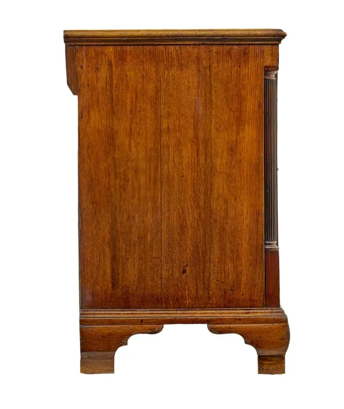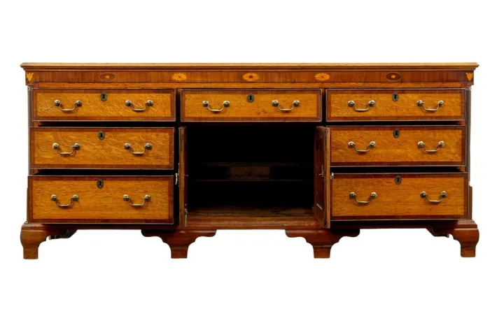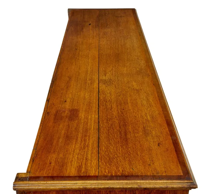 2 plank top with cross banded border and moulded edge. below a border of the same with inlaid symmetrical patterns. central drawer with a double door cupboard complete with original shelf and semi concealed drawer. flanked either side by 3 graduating drawers, all fitted with cock beaded edging, cross banded and brass handles. canted corners with an inset fluted column to each front edge, adds a nice finishing touch.