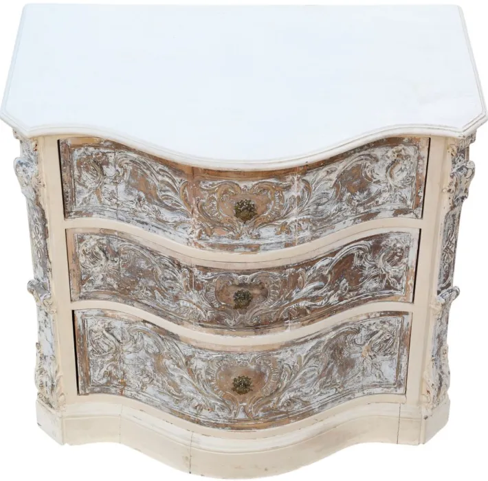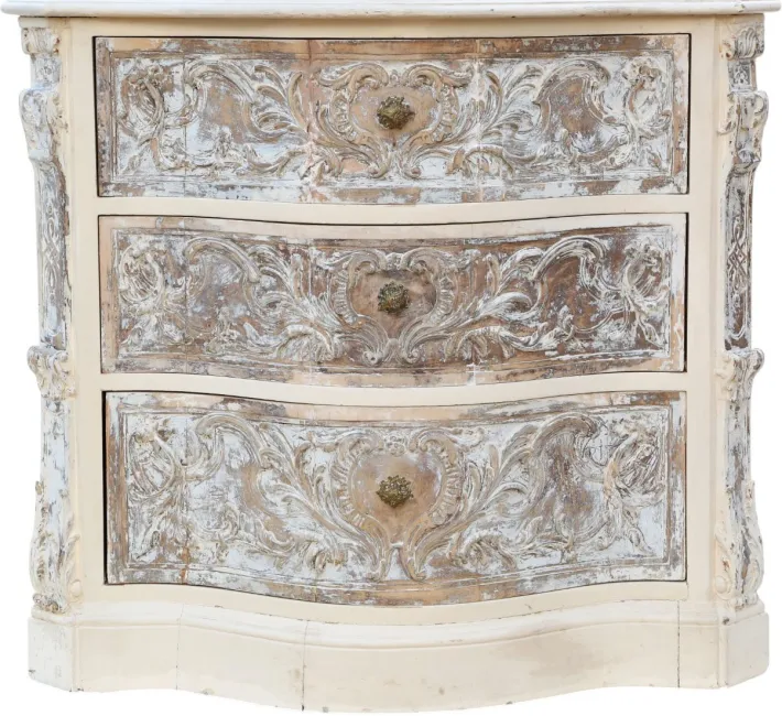 Heavily carved drawer fronts and serpentine canted corners