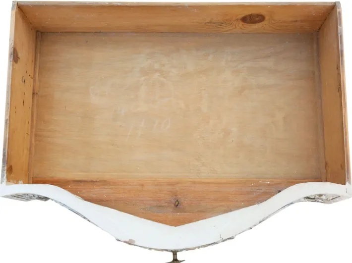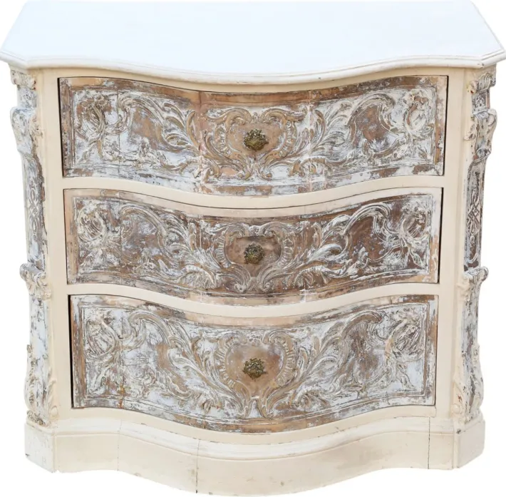 A fine Italian painted and carved serpentine chest of drawers, dating from around 1920. Featuring heavily carved drawers and canted front corners, this solid piece demonstrates craftsmanship and decorative appeal. The drawer fronts are particularly striking, each crafted from multiple pieces of timber. A rare and substantial decorative find.