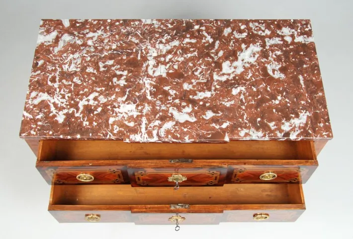 The top plate of red and white veined marble follows the shape of the body of the furniture, which protrudes in the middle like a risalit.