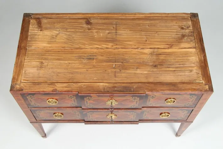 The elaborate marquetry is impressive. We see geometric, intertwined bands of slightly green-colored wood on backgrounds with diagonal grain patterns.