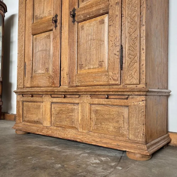 This elegant hall cupboard from 1836 impresses with its high-quality construction and impressive carvings. Made from solid oak, it combines timeless aesthetics with exceptional durability. The detailed decorations, the sweeping cornice and the classic ball feet give the cabinet a majestic appearance. Particularly practical: the integrated undershelf with chest function offers additional storage space. Three solid oak shelves ensure flexible use, as the interior layout can be customized. The cabinet is in its original condition with slight signs of use due to its age, which underline its authentic character. Due to its solid construction, it cannot be dismantled.