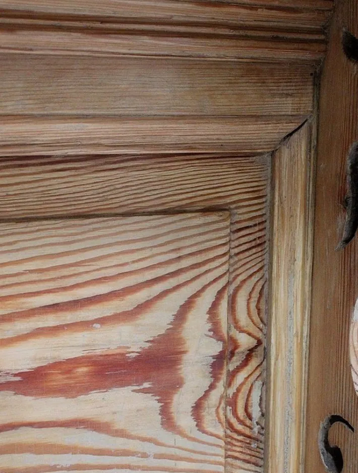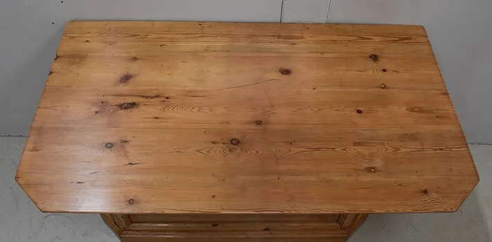 The fronts of this piece of furniture are composed of flat panels, sometimes assembled in one direction, sometimes in the other. They are underlined by Doucine strips forming frames. The front uprights are cut and moulded. The whole rests on a wide plinth.