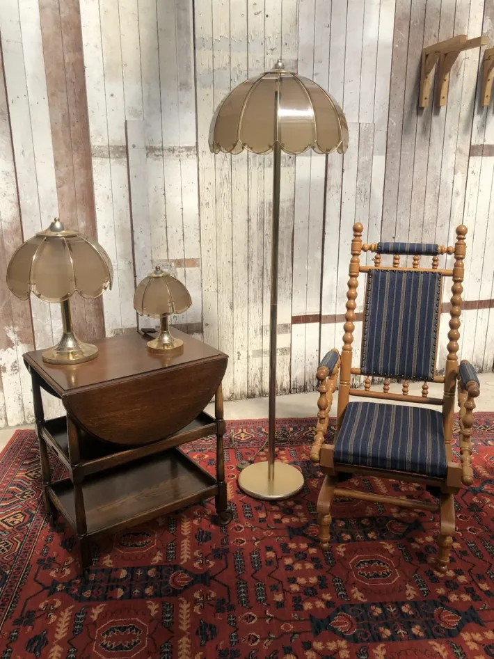 The chair has recently been reupholstered with a stylish, striped fabric that retains the authentic look, but adds a fresh and modern touch. The rocking mechanism provides a soothing and relaxing experience, perfect for a quiet corner in the living room or conservatory.
