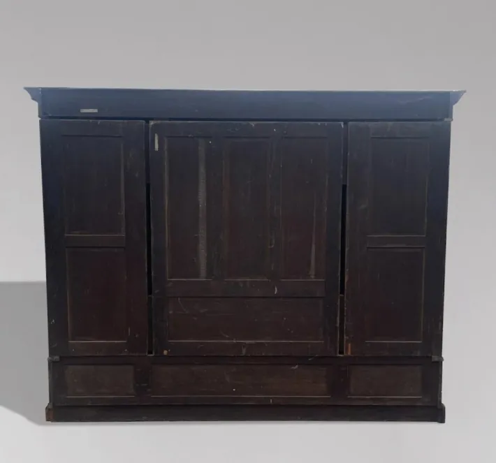 Both side compartments are designed for hanging clothing, while the central double compartment offers five sliding trays and three internal drawers with brass square campaign handles, providing excellent storage versatility. The wardrobe stands securely on an enclosed plinth base. All in perfect condition with a rich patination. The colour and finish are outstanding, having been professionally cleaned and polished in our workshops.