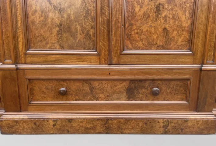 Very impressive mid-19th century, early Victorian period burr walnut 4-door breakfront wardrobe is a true statement piece. Crafted circa 1860, it features a moulded cornice above four long panelled doors in beautifully figured burr walnut. Below the doors is one long central drawer, flanked by two more drawers, all with original turned wooden handles and locks with a working key.