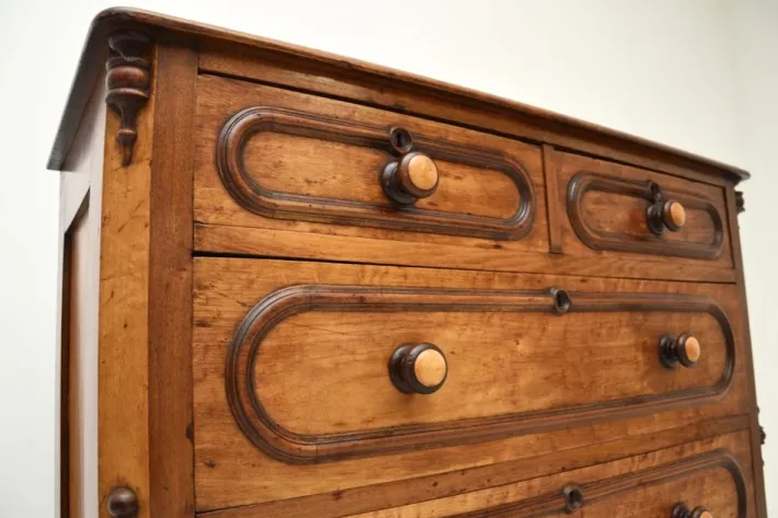 It is of outstanding quality and has a beautiful design. It is a great size, with plenty of storage space inside the generous drawers. The drawers have fine hand cut dovetailed joints and wonderful turned handles. The drawers fronts have lovely moulding around the edges, the front corners of the chests have beautifully made corbels at the top, middle and lower edges.