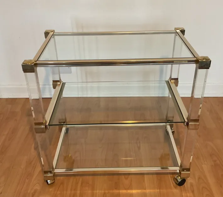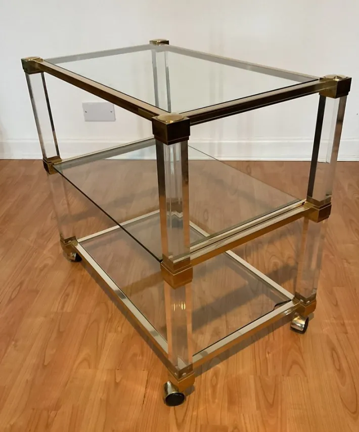 Featuring three glass tiers. with some light wear on the gold from normal use and ageing. Typical French Paris-style of the 70’s that represents the taste of the period and also gives a collector’s touch to a contemporary house. Very sophisticated and stylish!