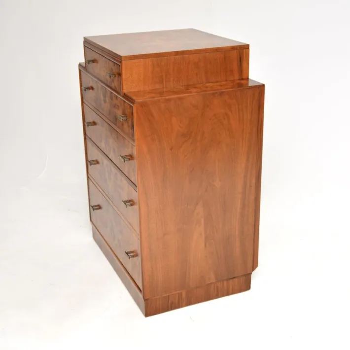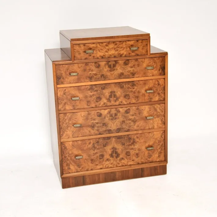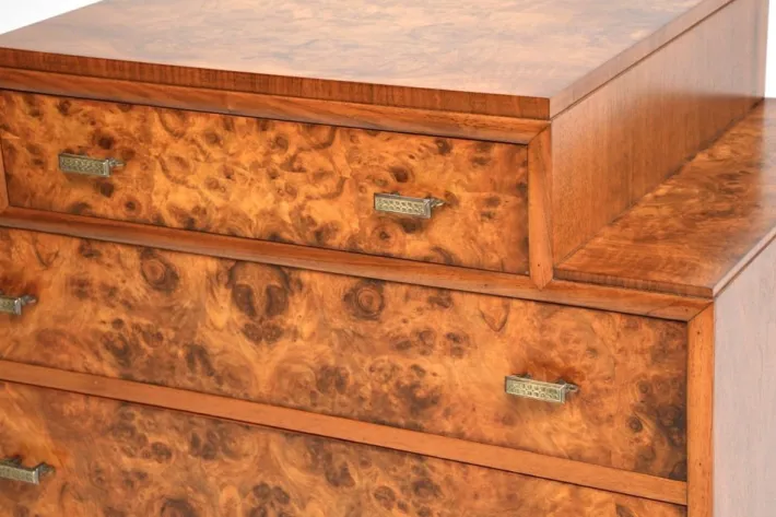 It is a lovely size and is of superb quality. There are incredibly beautiful burr walnut patterns, there is lots of storage inside the generous drawers. This sits on an banded walnut plinth base, it has a stepped top section and beautifully crafted nickel handles.