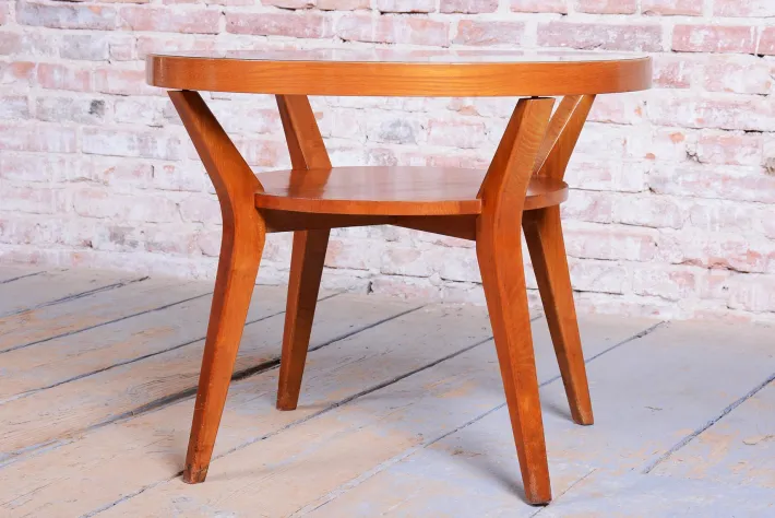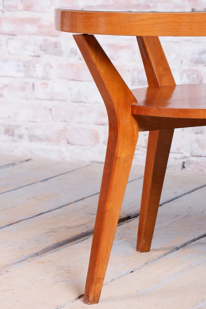 This iconic round Art Deco coffee table, designed by designers Karel Koželka and Antonín Kropáček, comes from Czechoslovakia from the 1940s. It was manufactured by České umělecké dílny and impresses with its timeless design and precise craftsmanship.