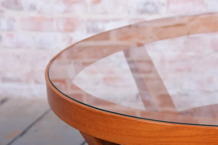 The table is made of solid oak and has a glass top. The shapes of the concentric circle are held in place by dynamic rounded legs, a characteristic geometry of mid-century modernism.
