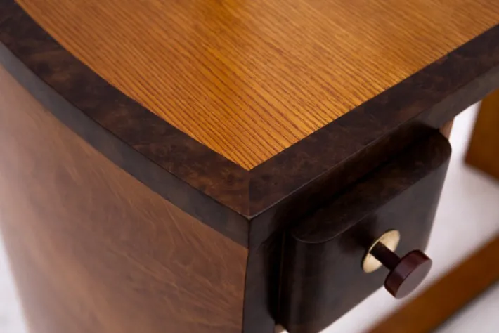 | Restoration and Damage Details | Light wear consistent with age and use, Surface has been refinished, Art deco dressing table + chair set, Poland, Art Deco, ca. 1940. AFTER RENOVATION.Very good condition, after professional renovation.Wood: walnutdimensionsdressing table height 129 cm width 90 cm depth 40 cmchair height 81 cm seat height 47 cm w |